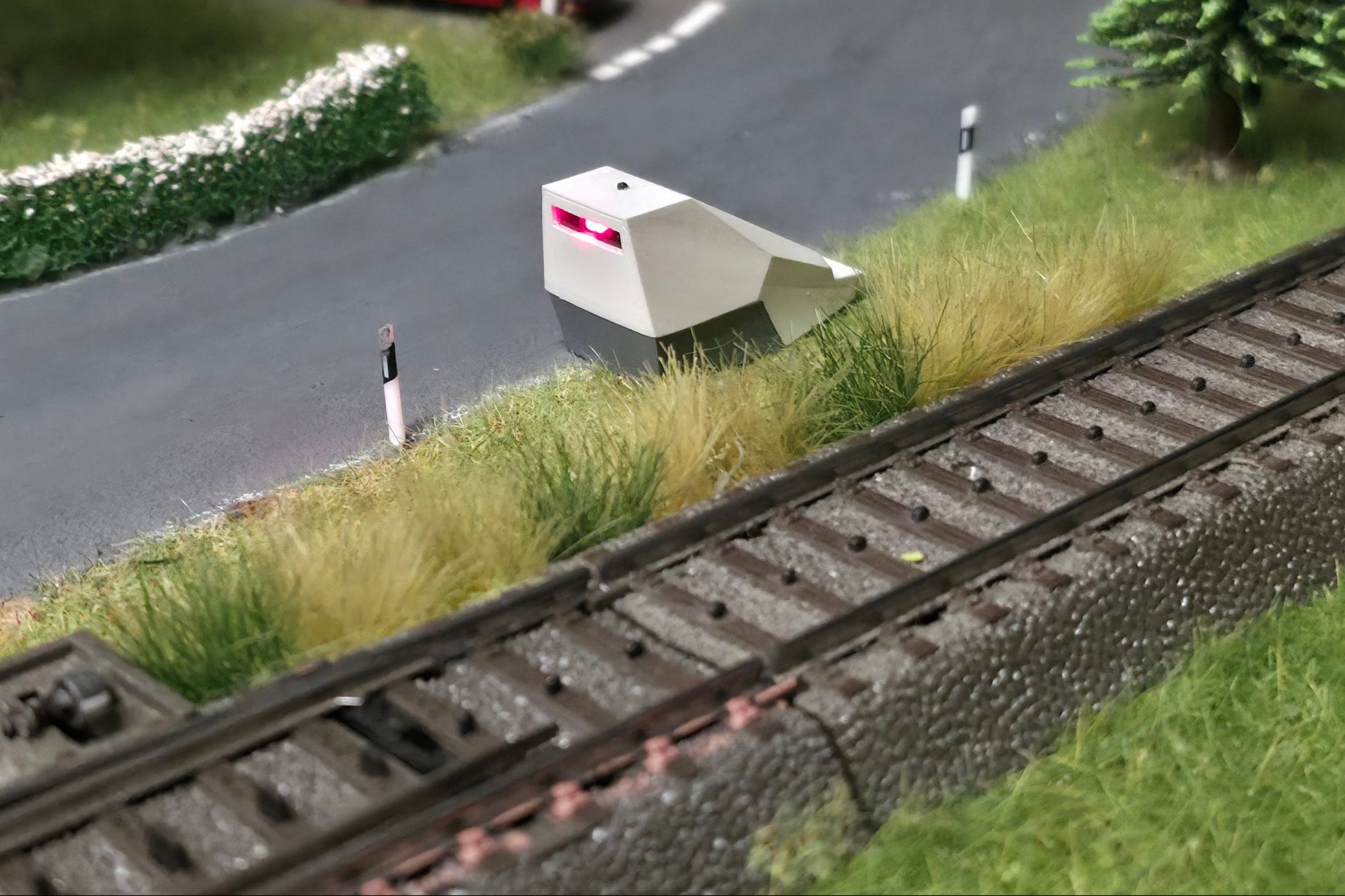 Sobald ein Fahrzeug, welches auf der Unterseite mit einem der mitgelieferten Neyodymmagnet ausgestattet auf den Blitzer zufährt, wird dieses geblitzt. Der Blitz ist dabei sehr am original und sorgt damit zu einen richtigen Hingucker auf ihrer Modellbahnanlage!